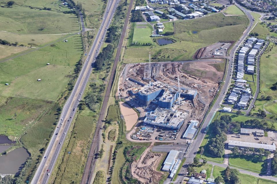 A recent drone shot of construction of the new Shellharbour Hospital at Dunmore, which is progressing on target. Photo: NSW Government.