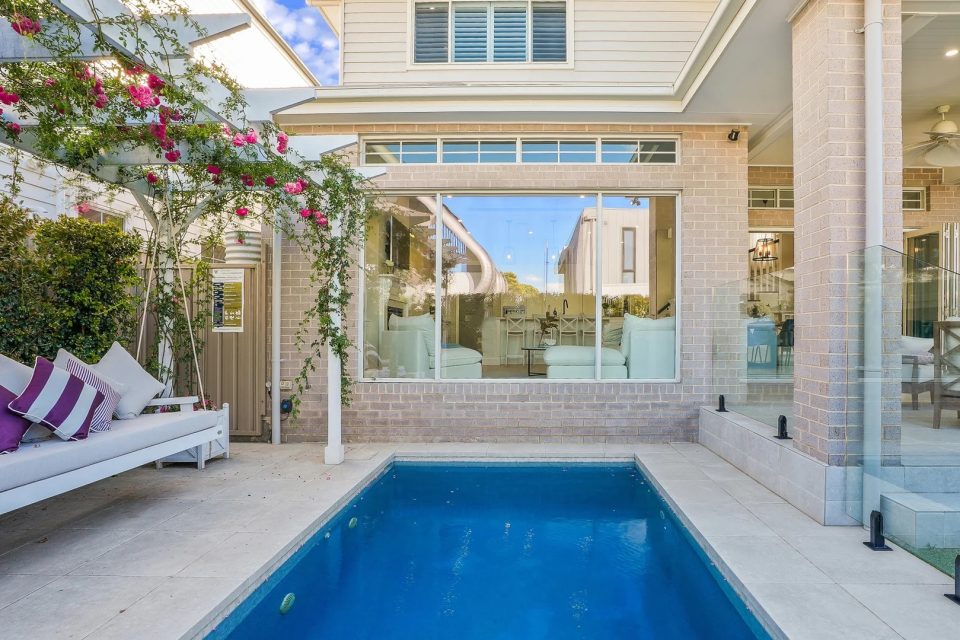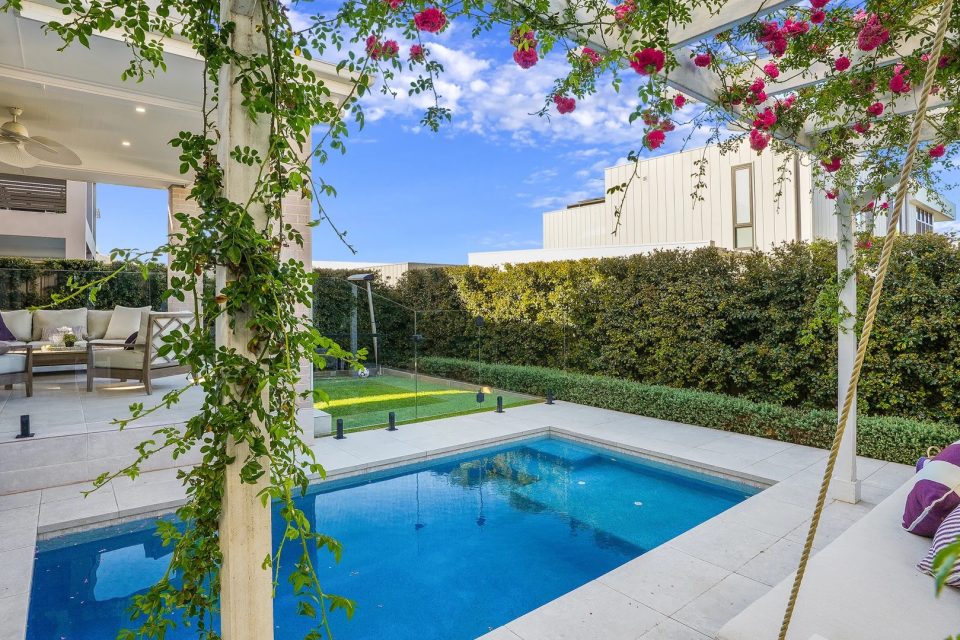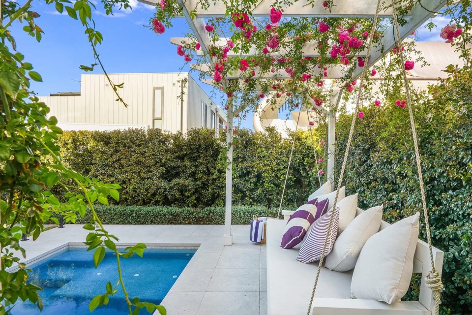 This Hamptons-style home overlooks a sparkling, heated swimming pool, complete with a swinging love chair and creeping roses straight from a dream. Photos: Hodder Borg.