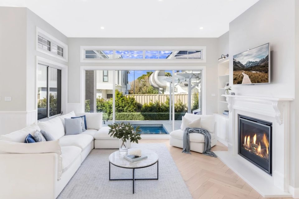The living space houses a custom mantel, gas fireplace and designer light fittings where one could happily spend the day with a good book.