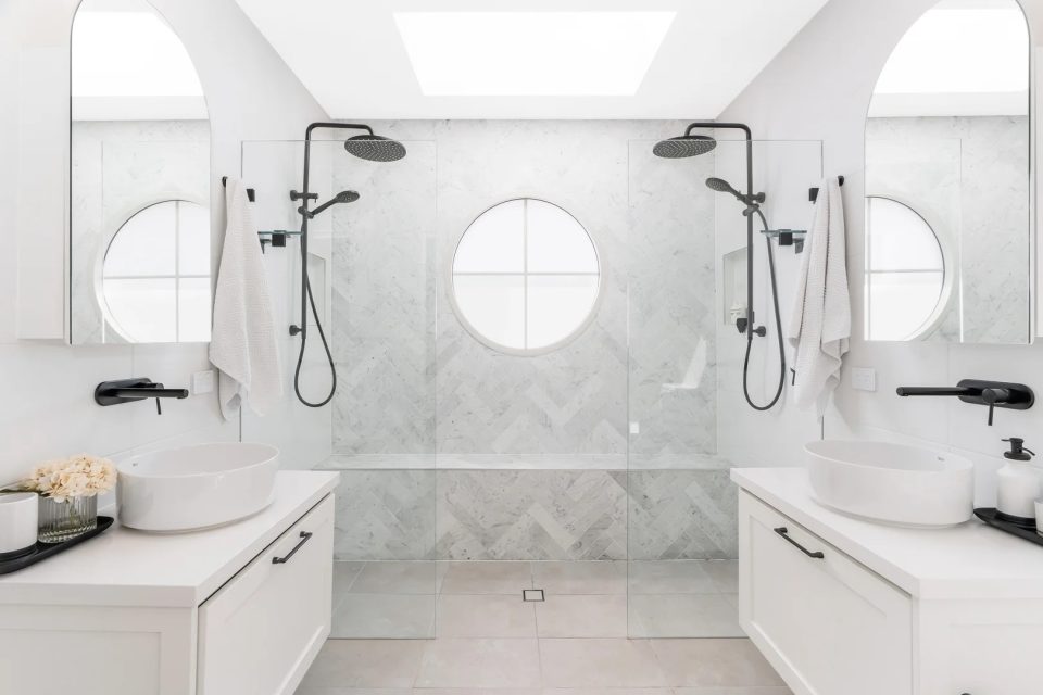 The aesthetic is characterised by a crisp white colour palette punctuated by black finishes, tonnes of natural light, soaring ceilings, herringbone engineered-hardwood floors and timeless wainscoting.