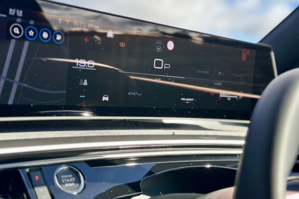 Unlike everything that has been called a mild hybrid up to this point, however, the 5008 can move at slow speeds under electric power alone. So, like a regular hybrid. Put your foot down a bit more, and the petrol engine chimes in with a bit of clunk – it’s not quite as smooth as a Toyota hybrid – and there’s a flare of noisy revs.