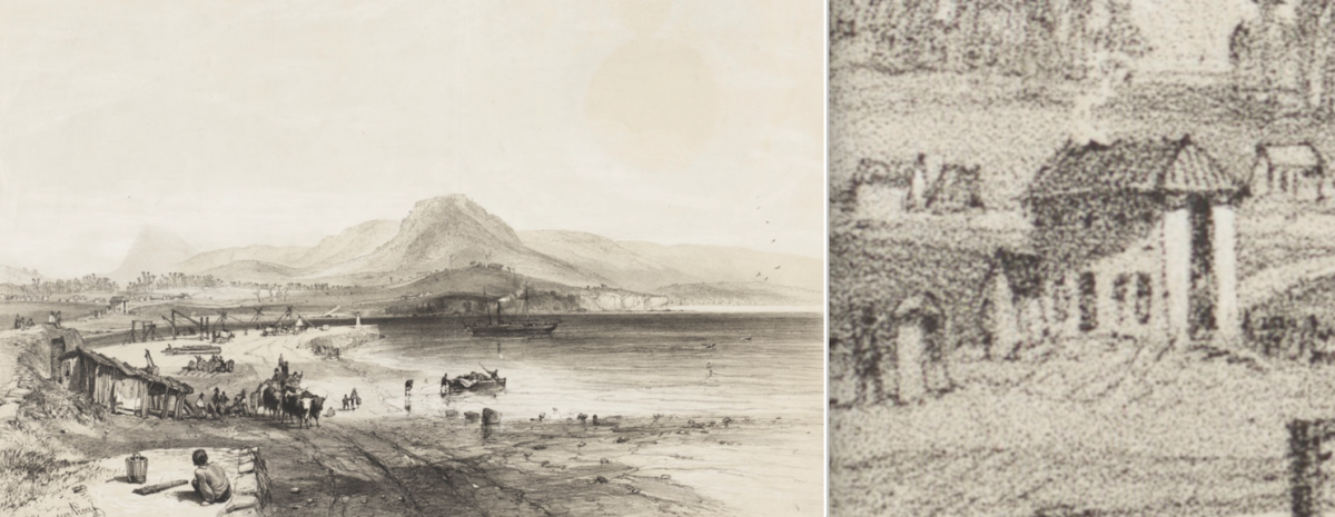 Left: John Skinner Prout produced the finest early lithograph of Wollongong Boat Harbour as seen in either 1841 or 1842. Right: An enlarged detail from the lithograph of Customs House. Photo: Mitchell Library/State Library of NSW.