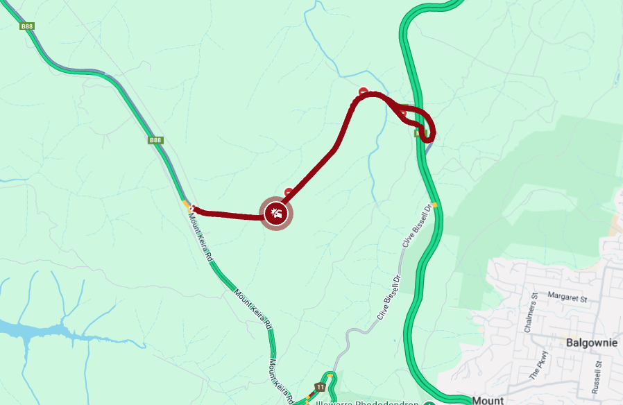Drivers are urged to avoid the area; light vehicles are directed to use Mount Keira Rd.