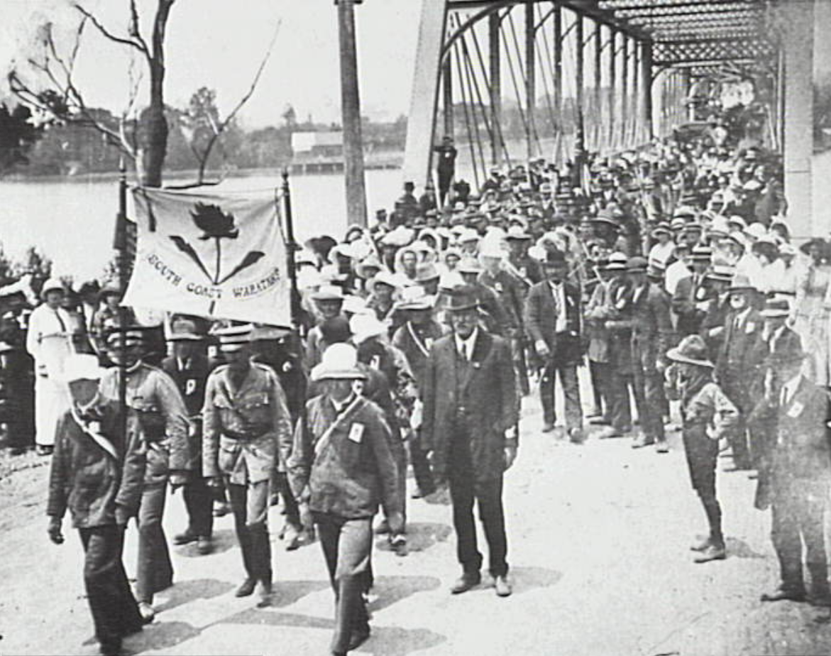 The South Coast Waratah March crossing Nowra’s Shoalhaven Bridge on 30 November 1915, on its way to Sydney. Photo: From the collections of Wollongong City Libraries and the Illawarra Historical Society – P08/P08495.