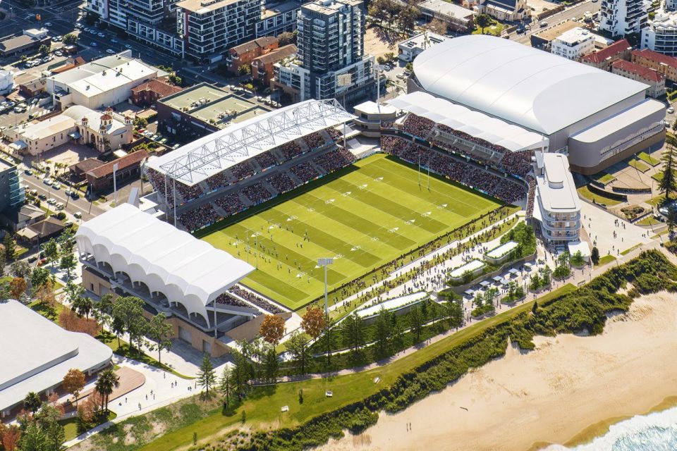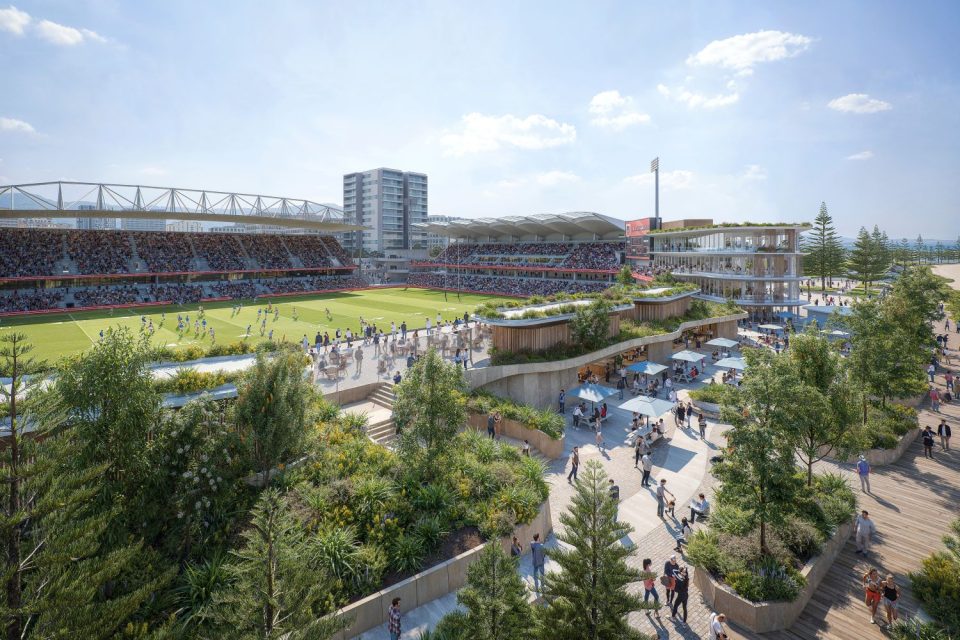 The precinct – expected to inject about $550 million into the local economy annually – will include a new beachside complex featuring a cafe, kiosk and toilets and multipurpose spaces for functions and special events on game day as well as all year round.