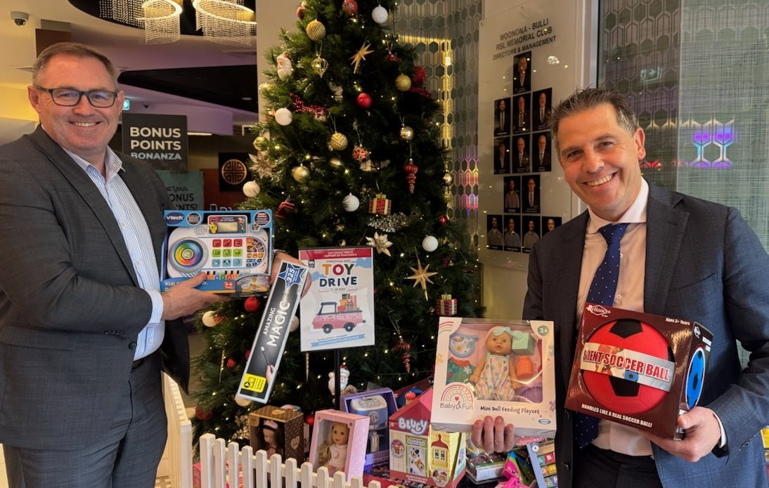 Woonona-Bulli RSL CEO Michael Brennan and Keira MP Ryan Park, surrounded by gifts donated to the Keira Christmas toy drive. Photo: Supplied.