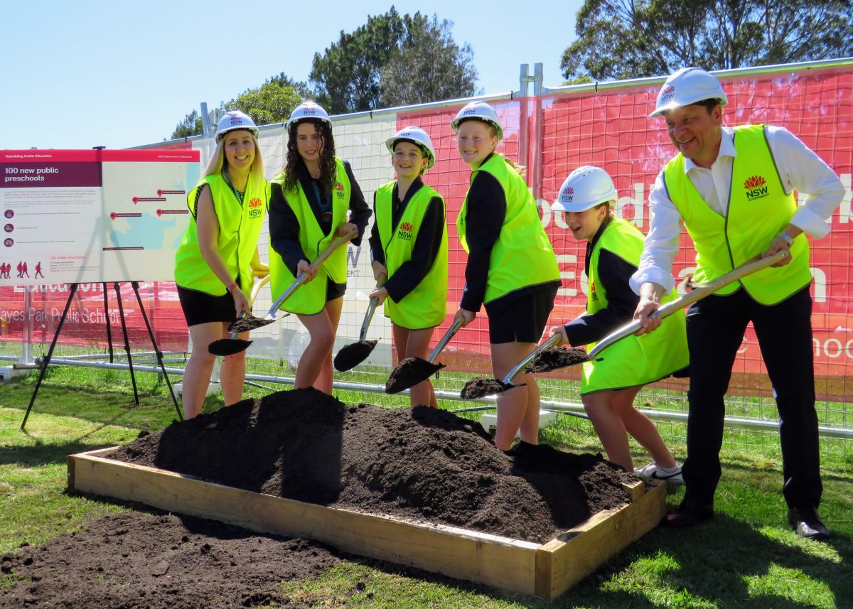 Hayes Park Public School relieving principal Lisa Matthers, student leaders Nyah Boardman, Summah Barbour, Senara Hall and Sophia Micallef turn the sod on a new public preschool with Wollongong MP Paul Scully. Photo: Zoe Cartwright.