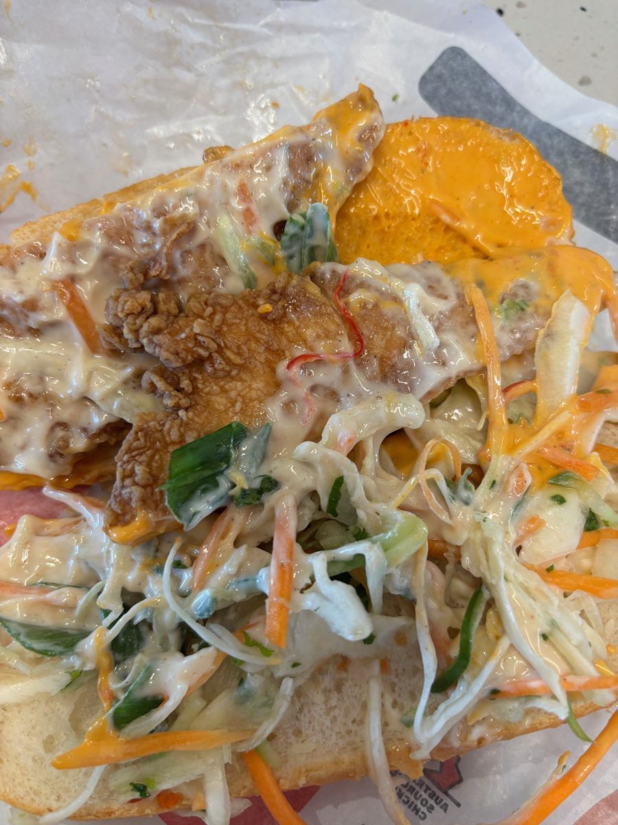 It’s missing some of the things you’d expect on traditional banh mi, like pickled vegetables and protein that’s grilled, not fried.